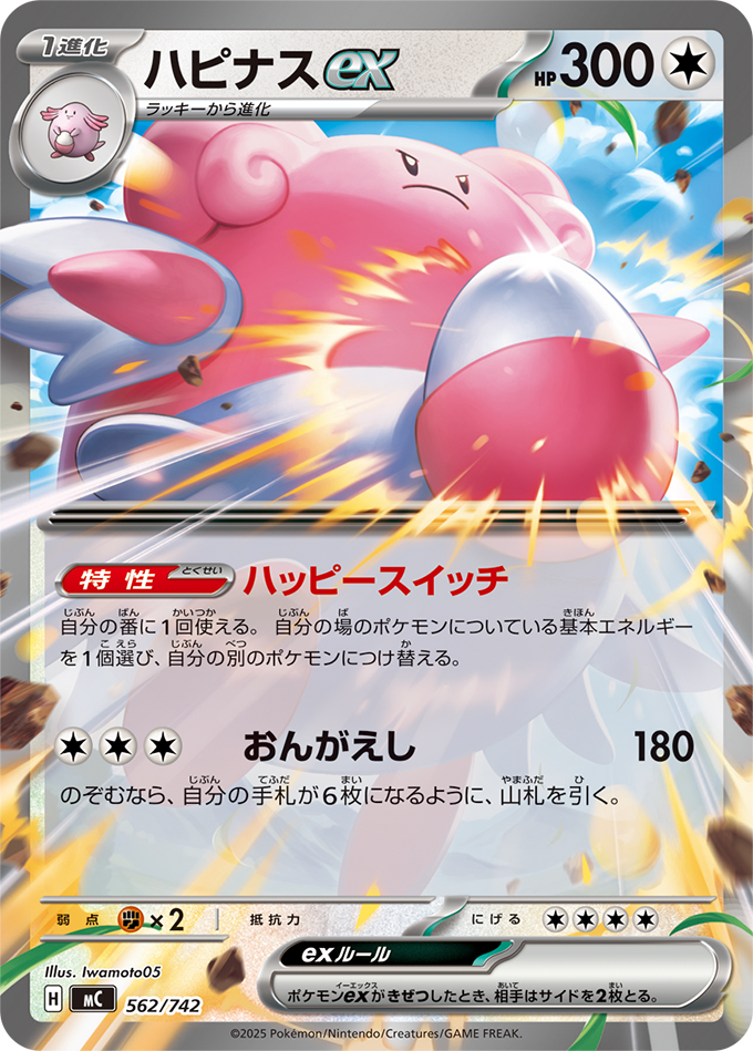 ハピナスexは特性で「エネルギーつけかえ」と同じ効果を発揮して、後方で活躍することもできる上、ワザで手札補充もできる優秀なカードです!